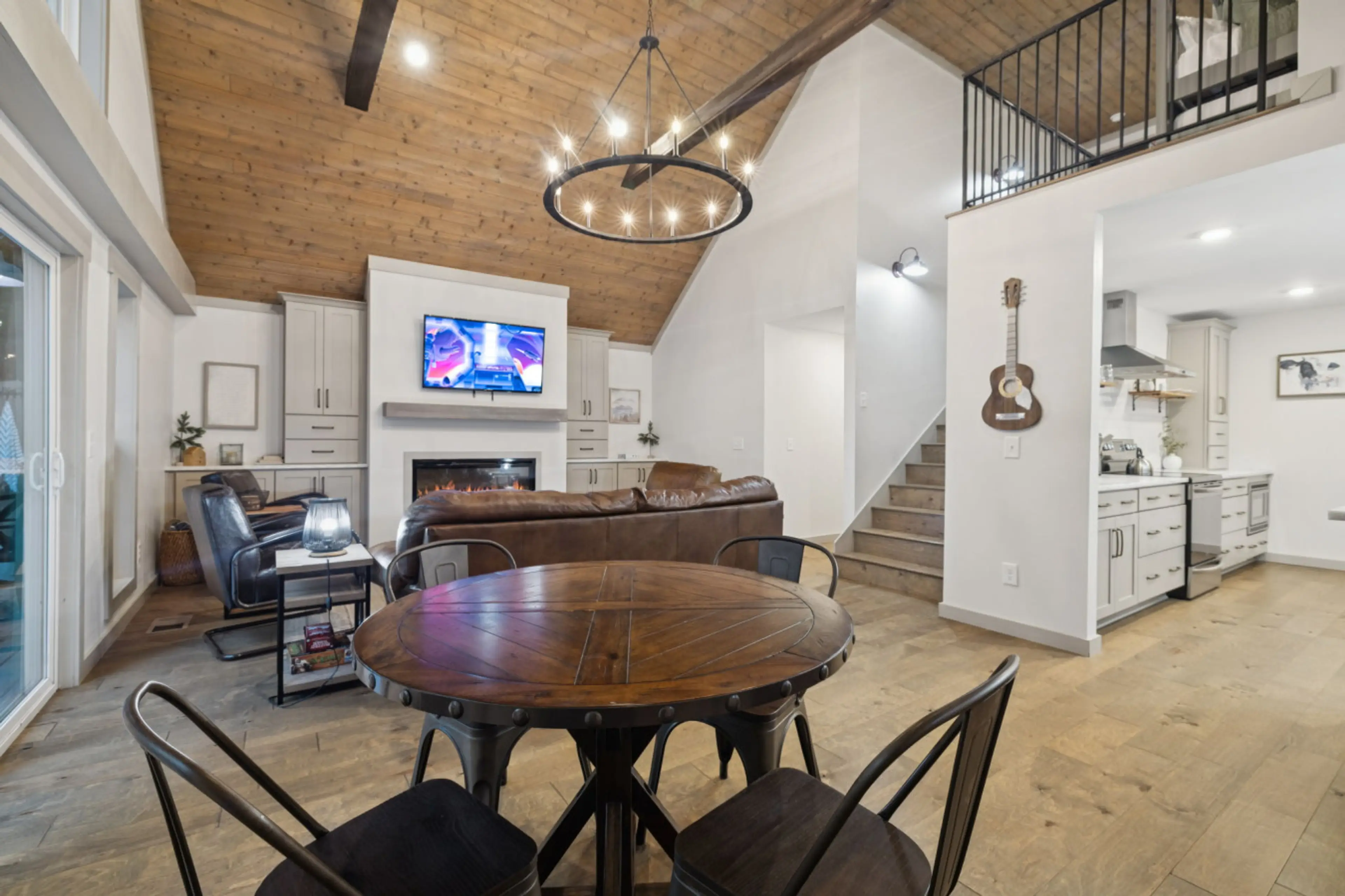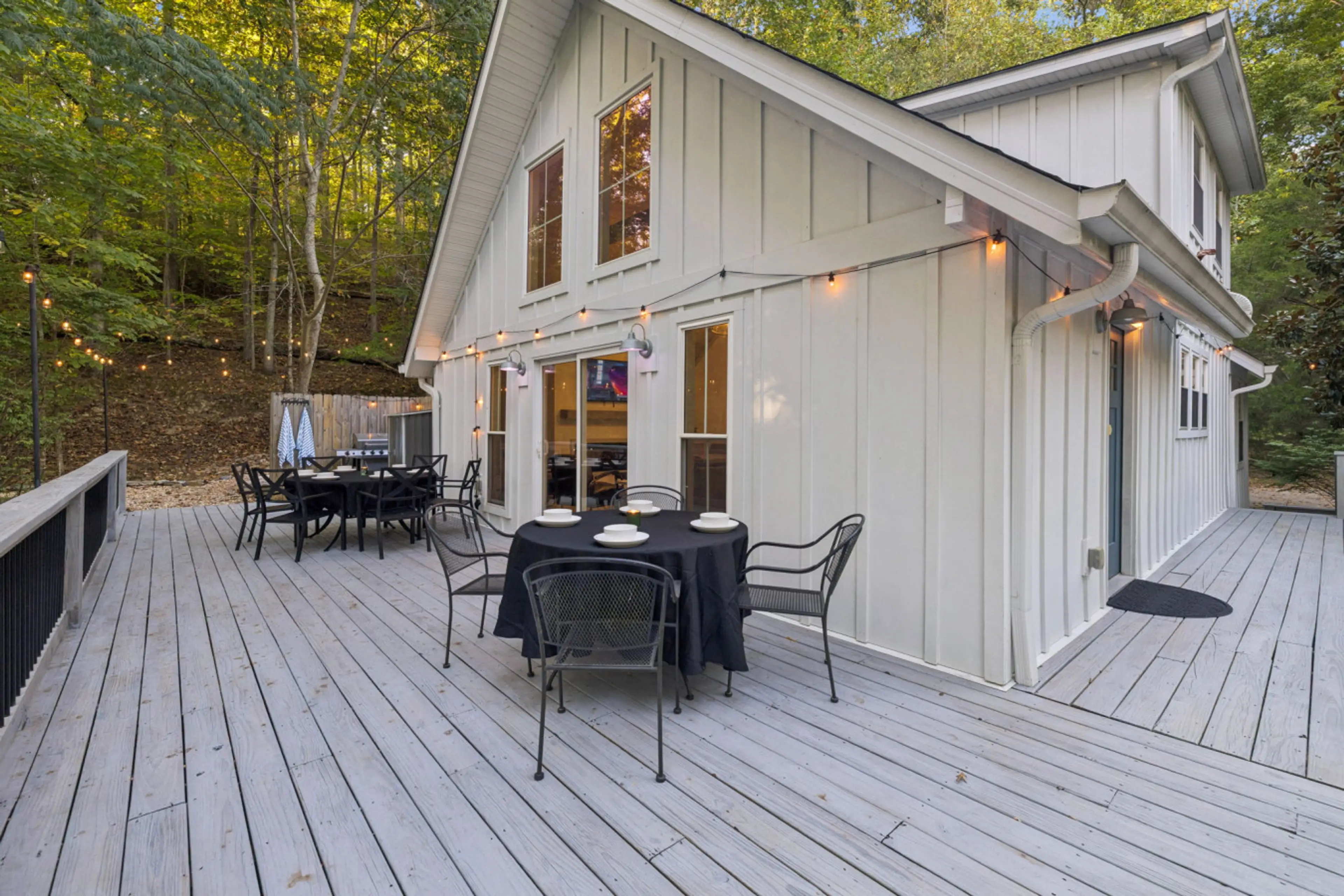 Cook up a juicy BBQ dinner from the deck patio overlooking lush woods. After dinner, take a load off in a living room with wood-paneled cathedral ceilings and a sleek fireplace. Gather around a fire pit enveloped by forest for a magical night in.
